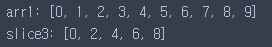slice1과 slice2의 출력값이 같은 것을 통해 "step"의 기본값은 1임을 확인할 수 있습니다.